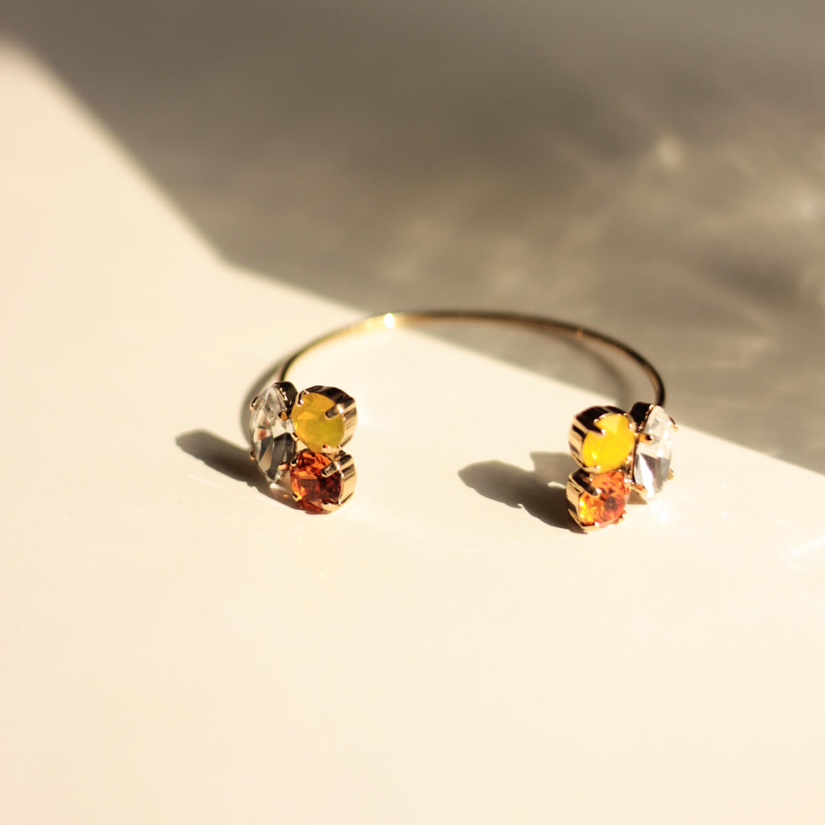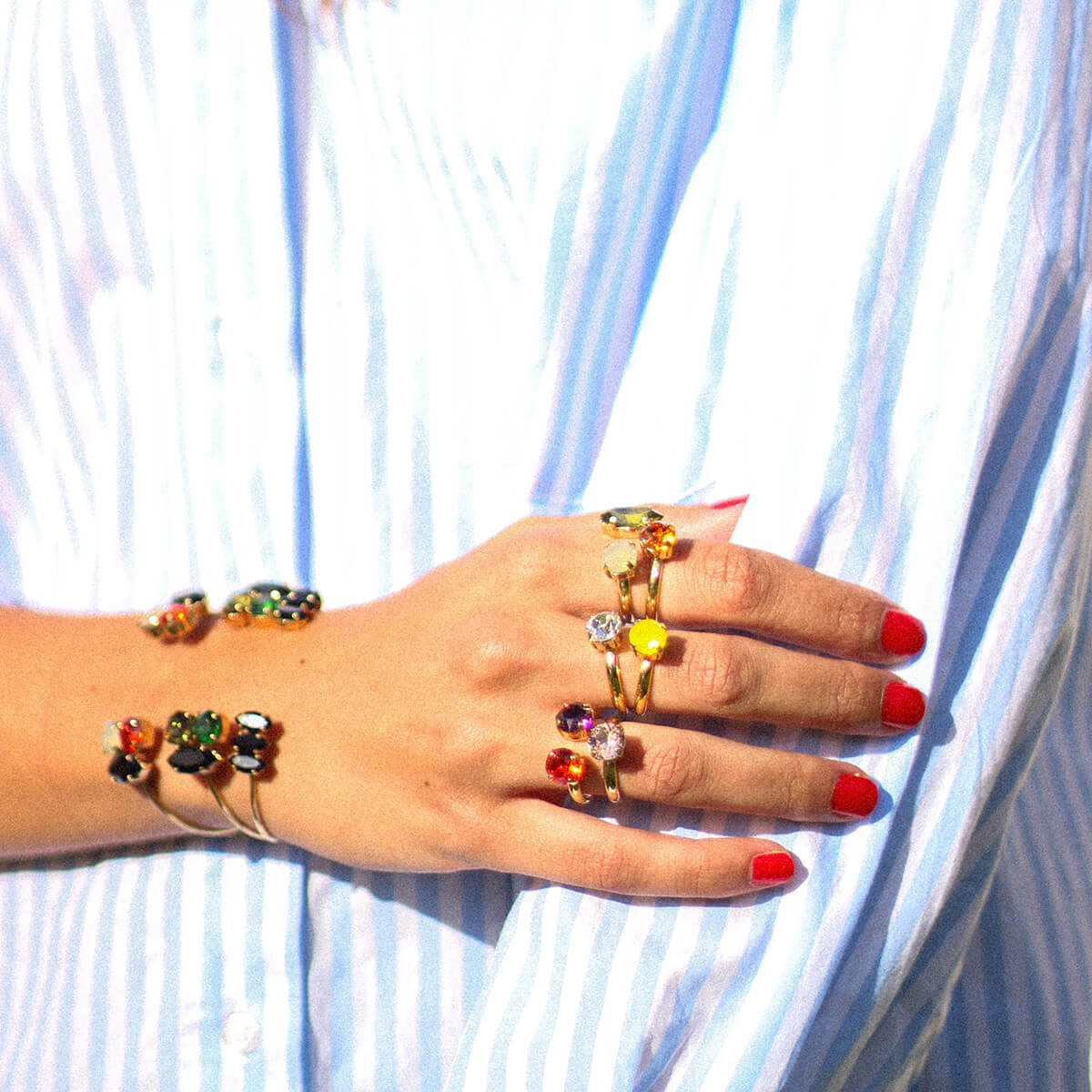 Habituellement utilisé dans la lunetterie, la créatrice a choisi l'acétate de cellulose pour ses créations. Une matière très légère, chic, résistante et aux multiples teintes.