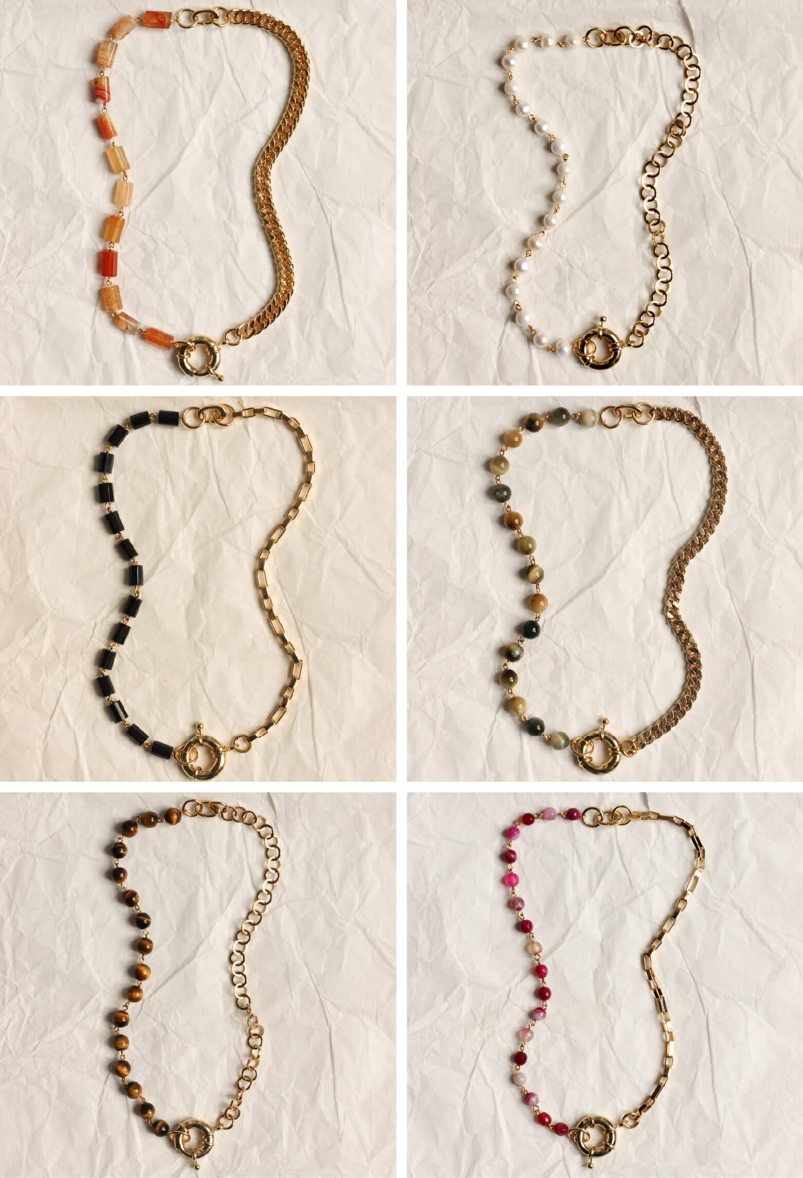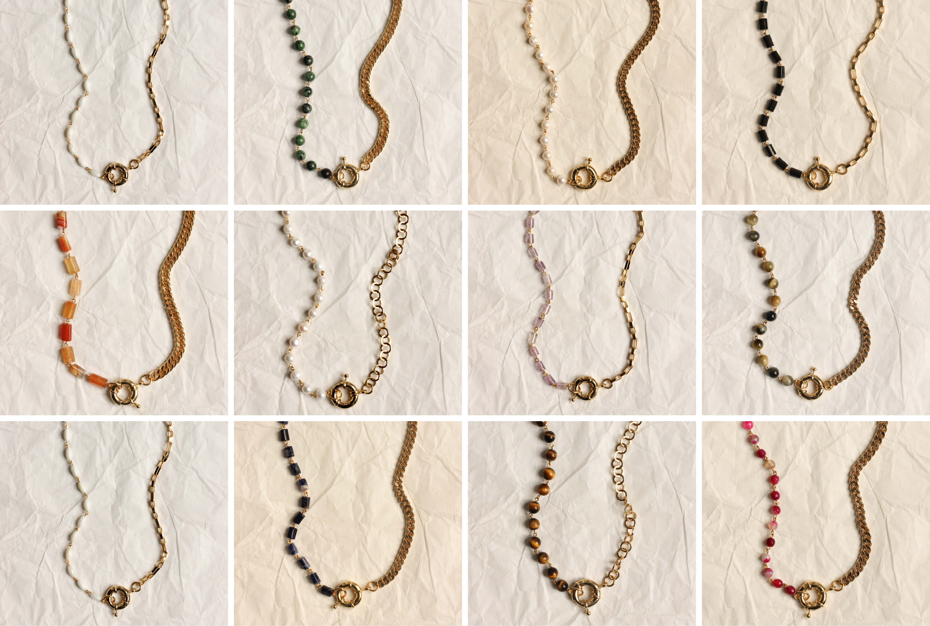 Amusez-vous! Mixez les chaînes et les perles pour imaginer un collier unique et aux multiples looks!