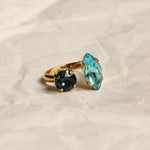 Notre nouvelle bague qui brille de milles feux. Un anneau minimaliste réhaussé de deux cristaux pour un style intemporel. Pour la touche originale, la bague se porte ouverte sur le dessus du doigt.