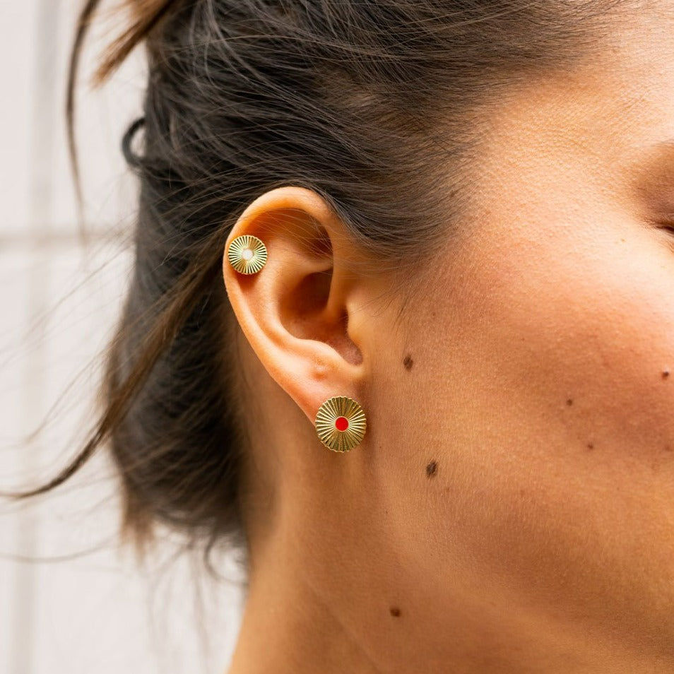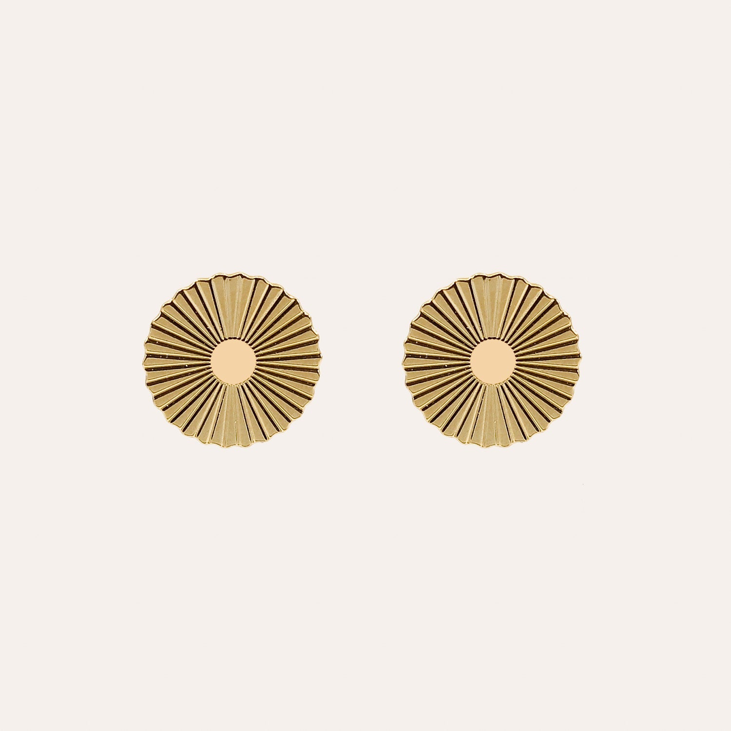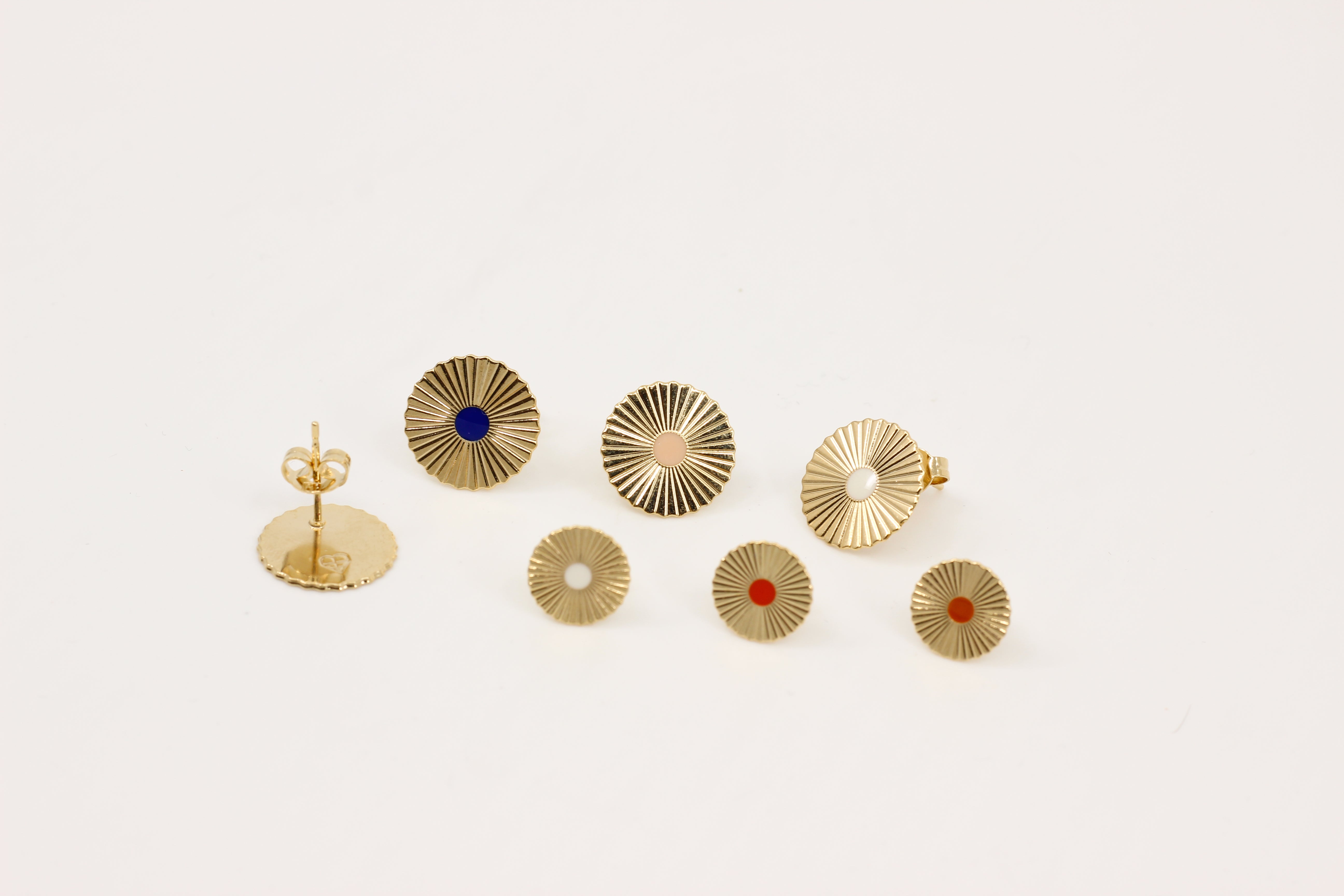 Avec leur jeu de gravure solaire, les puces Daisy accrochent la lumière comme de petites boules à facettes à vos oreilles. A porter sans modération! A combiner avec les mini puces Daisy pour jouer avec les différentes tailles.