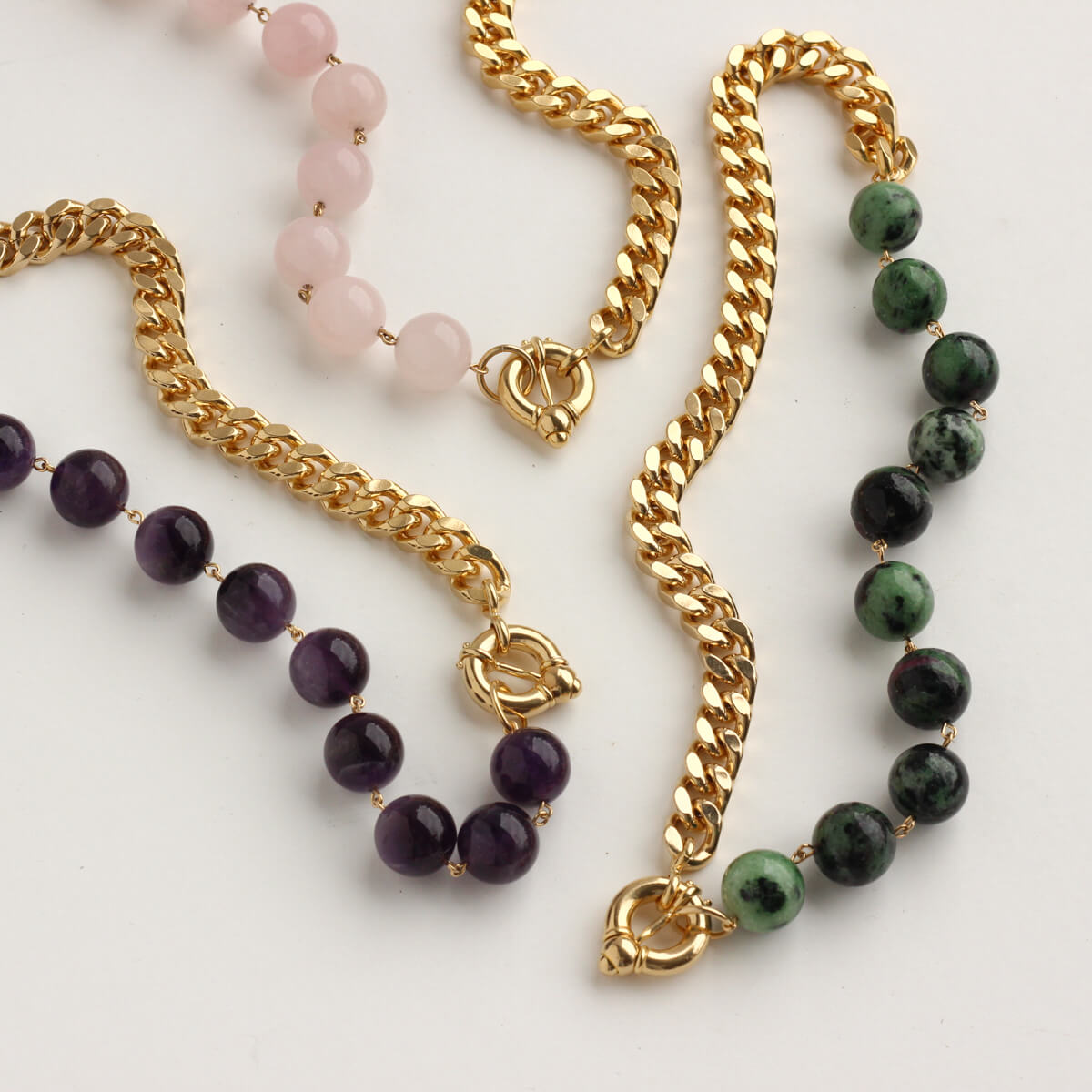 Pour certains de nos bijoux, nous utilisons des perles fines naturelles comme du quartz ou de l'améthyste. Ainsi que de véritables perles de culture d'eau douce pour des bijoux de qualité.